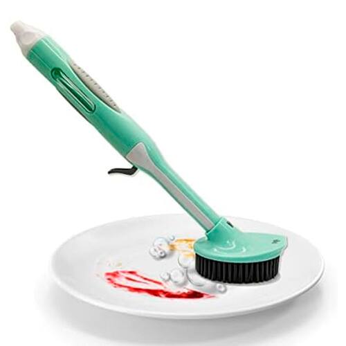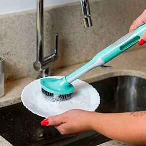 A Escova de Limpeza com Dispenser traz mais economia de tempo, menos esforço e menos desperdício de detergente para lavar louças e objetos, graças ao seu sistema de dispenser para detergente e material de cerdas flexíveis em nylon, possibilitando uma limpeza eficiente. Bora comprar a Escova e ter praticidade e velocidade para lavar louças? Itens: 01 Escova de Limpeza 2 em 1 Com Dispenser para Detergente