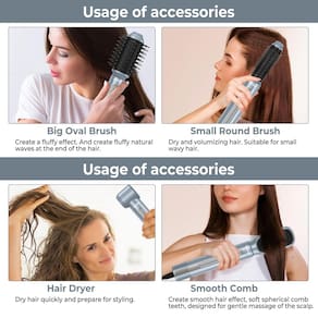- Escova secadora de alta velocidade 6 em 1: pressione e segure o botão liga/desliga 2s para ligar/desligar o secador de cabelo. O kit de modelador de cabelo 6 em 1 inclui 1 secador de cabelo iônico de alta velocidade, 2 rolos de cabelo para enrolar em diferentes direções, conjunto automático de cachos. Tecnologia, 1 escova redonda suaviza e adiciona balanço, 1 volumizador, reduz a estática e os emaranhados, aumenta a maciez, 1 escova alisadora de cabelo de massagem para alisar e suavizar. Explore estilos para qualquer tipo de cabelo, economizando seu tempo e dinheiro.