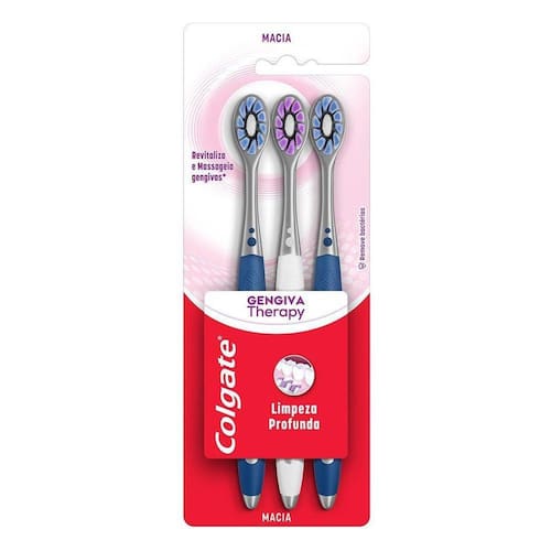 Escova Dental Colgate Gengiva Therapy 3 unidades Colgate Gengiva Therapy possui cerdas inovadoras que proporcionam alta formação de espuma e cabeça compacta para melhor alcance dos dentes posteriores. Cerdas macias de alta densidade para massagear suavemente as gengivas. Limpeza superior, limpa além da linha da gengiva. - Compre produtos Colgate