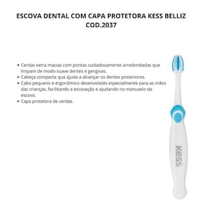 Escova Dental Kess Steps Com Capa ProtetoraCaracterísticasA linha Kess Steps foi desenvolvida para acompanhar e motivar as crianças no processo de auto-higienização bucal. Para cada estágio da infância, um Step diferente! Todas as escovas da linha Kess Steps possuem:Cerdas extra macias com pontas cuidadosamente arredondadas que limpam de modo suave dentes e gengivas.Cabeça compacta que ajuda a alcançar os dentes posteriores.Cabo pequeno e ergonômico desenvolvido especialmente para as mãos das crianças, facilitando a escovação e ajudando no manuseio da escova.Capa protetora de cerdas..DiferencialDesenvolvido especialmente para as mãos das crianças, ajudando no manuseio da escova e facilitando a escovação, limpando de modo suave dentes e gengivas. Além de terem formatos e desenhos lúdicos para incentivar esse hábito importante!.Modo de uso1 – Para abrir a capa protetora, utilize o apoio na parte de baixo e deslize para o lado. Após aberto, retire de dentro do bichinho as duas ventosas.2 – Encaixe as ventosas na parte de trás onde há duas aberturas. Coloque pela parte maior da abertura e deslize para a parte menor a fim de travá-la.Fixe a capa protetora em uma superfície lisa e certifique-se de que está bem presa.3 – Com a capa protetora aberta, coloque a escova dental e pressione ao fundo para que se feche.4 – Para abrir basta puxar a escova para frente..Cerdas: Extra macias