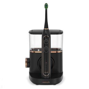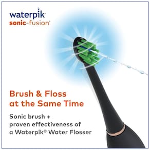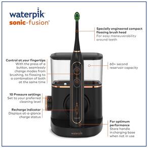 Cor Preto. A escova de dentes do fio dental Waterpik Sonic Fusion SF 02 combina o poder de uma escova de dentes elétrica Sonic recarregável avançada com a eficácia comprovada do Waterpik Water Flosser. UM DISPOSITIVO FAZ TUDO A tecnologia do fio dental está integrada na cabeça da escova para fornecer uma limpeza completa. Com o apertar de um botão, o Waterpik Sonic Fusion muda perfeitamente da escovação para o fio dental para ambos e remove as bactérias nocivas e detritos entre os dentes e abaixo da linha da gengiva que a escovação tradicional e o fio dental não podem alcançar. CARACTERÍSTICAS E NA CAIXA 2 cabeças de escova de fio dental com código de cores Cabeça de escova projetada para alcançar os dentes traseiros no ângulo correto para o fio dental com água Cronômetro de escovagem de 2 minutos com marcapasso de 30 segundos Controle avançado de pressão de água com 10 configurações Escova de dentes recarregável e base de carregamento recarregável Escova de dentes luz indicadora Estojo de escova de dentes Deluxe para viagem O reservatório retém 414ml de água por 60 segundos de tempo de uso do fio dental Pode ser com seu enxaguatório bucal favorito Marca: Não Informado