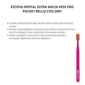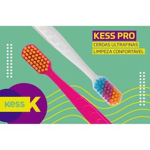 Escova dental com cerdas feitas de um material diferenciado, importado da Alemanha, que é tão fino quanto um fio de cabelo! Por isso, são ainda mais macias que as tradicionais, que tem cerdas de nylon.E o resultado disso é LIMPEZA EFICIENTE e CONFORTÁVEL!Devido a quantidade e a espessura das cerdas, as escovas da linha Kess Pro atingem áreas inacessíveis às escovas comuns. As cerdas especiais ainda conseguem neutralizar a força excessiva durante a escovação, agredindo menos as gengivas.