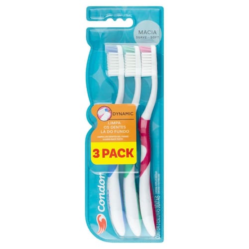 A Escova dental Condor Dynamic contém cerdas cônicas macia, limpam os dentes e gengiva com muita delicadeza. As pontas superfinas alcançam os lugares mais difíceis sem machucar a gengiva. O limpador de língua emborrachado ajuda a eliminar as bactérias que causam o mau hálito.