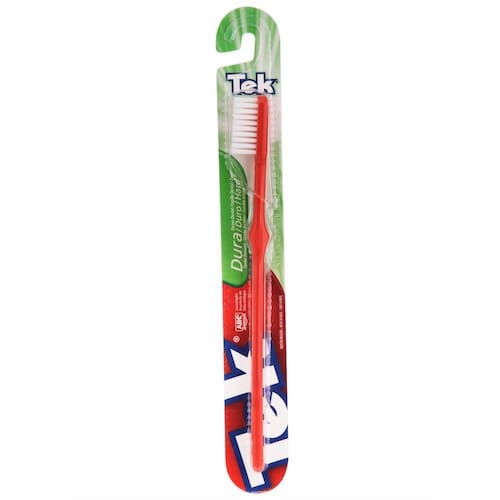 As escovas de dentes TEK foram as primeiras do mundo a apresentarem cerdas de nylon. Possui cabeça ovalada e pequena que alcança os lugares mais difíceis da boca sem machucar a gengiva. Seu cabo fino proporciona melhor manuseio e suas cerdas são arredondas e duráveis.
