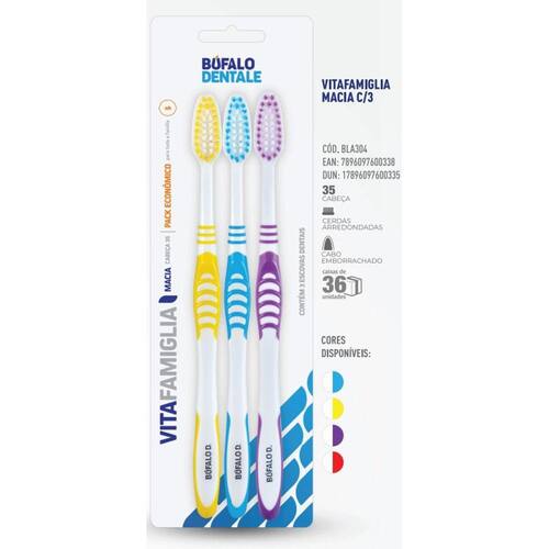 A Escova Dental Vita Famiglia Macia da Búfalo foi desenvolvida com a tecnologia de ponta - A escova promove uma limpeza profunda e delicada. Feita para promover os cuidados essenciais da sua saúde bucal. Para um cuidado ideal, utilize-a sempre após as refeições e antes de dormir. Apresentação: Embalagem econômica contendo 03 unidades da Escova Dental Vita Famiglia Macia Búfalo.