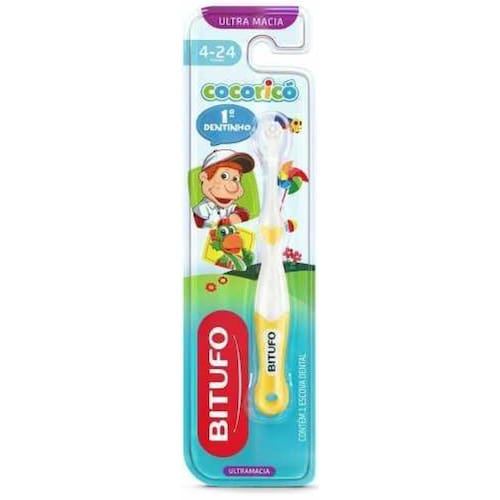 Principais especificações técnicas: - Marca: Bitufo - Modelo: Cocoricó 1º Dentinho Ultramacia - Indicação: Crianças entre 4 a 24 meses - Cabeça pequena e cerdas ultramacias - Altura adequada e acabamento arredondado - Material: Plástico - Dimensões: Largura 15 cm x Altura 10 cm x Comprimento 24 cm - Peso: 100g aproximadamente