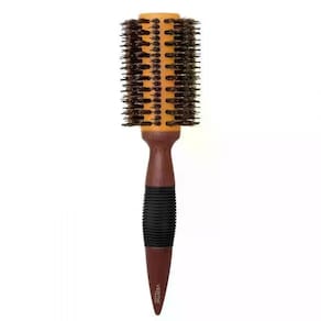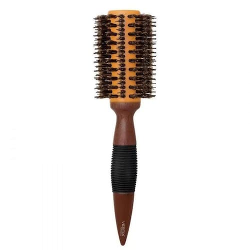 Escova redonda de madeira com base de cerâmica e cerdas naturais de javali intercaladas com pinos de nylon. A base de cerâmica retém o calor do secador por mais tempo, além de distribui-lo mais uniformemente. As cerdas e pinos proporcionam a tração ideal para cabelos mais volumosos e difíceis de penetrar.