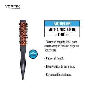 Escova de cabelo com base térmica de cerâmica ideal para modelar e criar cachos em cabelos curtos e médios e cerdas de nylon resistentes ao calor incorporadas com íons de prata que bloqueiam e eliminam a presença de bactérias.