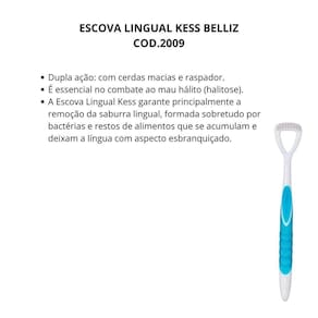 A Escova Lingual Kess é essencial no combate ao mau hálito (halitose). O design da Escova Lingual Kess proporciona dupla função: as cerdas de nylon macias limpam a superfície da língua de forma delicada e o raspador recolhe e elimina resíduos. A Escova Lingual Kess garante principalmente a remoção da saburra lingual, formada sobretudo por bactérias e restos de alimentos que se acumulam e deixam a língua com aspecto esbranquiçado.