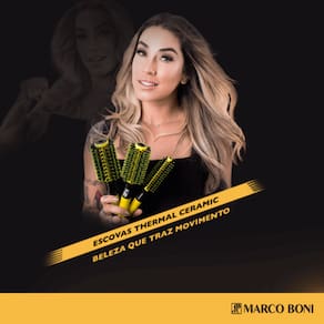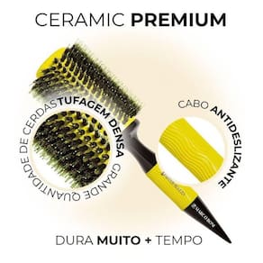 - Escova Pro Thermal Ceramic Premium 60mm Ref 7967T - Cerdas dupla altura: cerdas de javali e nylon que proporciona maior tração aos fios; - Tufagem reta: desliza com mais facilidade nos cabelos; - Cabo antideslizante; - Cabo separador de mechas; - Tamanho: 60mm de diâmetro; - Thermal Ceramic: corpo revestido de cerâmica; ajuda a manter a temperatura do secador de modo uniforme e prolongado; agiliza a secagem. - Dicas de uso: Envolva uma mecha nas cerdas da Escova Pro Tools, e utilize o jato de ar quente soprando de cima para baixo, evitando o efeito arrepiado.Comece o movimento de escovação pela raiz, passe para a metade do comprimento da mecha até as pontas. Para modelar e selar os fios, sem causar danos aos cabelos, utilize a face lisa de alumínio, que aquecerá rapidamente, deixando sua escovação perfeita. Repita esse procedimento em todas as mechas. - Dicas de conservação: Para conservar sua escova, o ideal é manter uma distância mínima de 5 a 7 centímetros do secador.