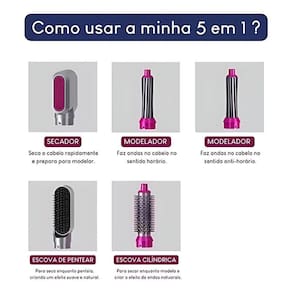 Escova Modeladora 5 em 1 com Secador de Cabelo 220v Kit 5 em 1 Secador Modelador Escova de Cabelo Alisadora ElétricaDescrição: Na correria do dia a dia, o que a gente mais precisa é de praticidade. E, na hora de cuidar dos cabelos, ter uma solução que seja prática e, ao mesmo tempo, entregue mais possibilidades com excelente resultado, é sonho de consumo. Esse Kit 5 em 1 é a inovação que chega para resolver o seu visual de um jeito muito fácil, sem você depender de ninguém. Ela é tão versátil que, sozinha, seca, desembaraça, alisa, disciplina e ainda modela seus cabelos, em poucos minutos e com apenas um movimento.