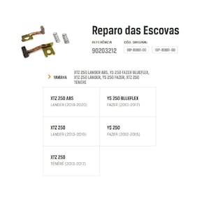 Escova Suporte Motor Carvão Aplicação: - Fazer 250 ano 2012 em diante - XTZ 250 Lander ano 2013 em diante - XTZ 250Z Tenere ano 2013 em diante Descrição - O suporte e escovas têm a função de transmitir a corrente elétrica às partes móveis do motor de partida. - Acabamento superior - Facilita a instalação da peça - Escovas com dureza projetada para proporcionar maior durabilidade - Aumentam a vida útil da peça - Cobre de alta condutibilidade elétrica - Aumenta a eficiência da peça