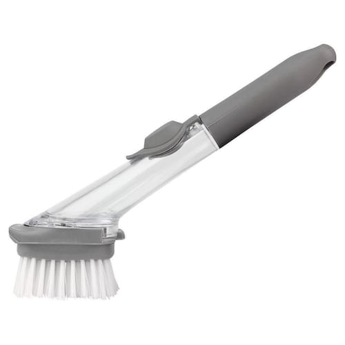 Acompanha uma escova e uma esponja, escolha qual se adequa melhor para o seu uso e encaixe no dispenser de detergente.