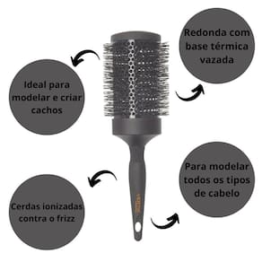 Escova térmica de cerâmica ideal para modelar e criar cachos em cabelos muito longos. Cerdas ionizadas contra o frizz. Escova de cabelo redonda com base térmica vazada de cerâmica e cerdas de nylon ionizadas tamanho extra grande.
