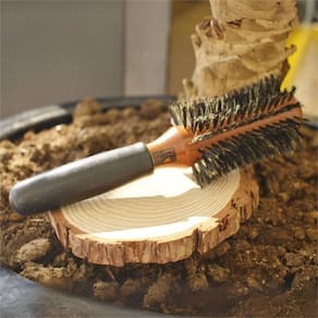 Escova profissional com corpo de madeira, cerdas mistas de nylon e javali que proporcionam mais brilho para os cabelos. Com tufagem reta que desliza com mais facilidade nos fios, evitando quebras.