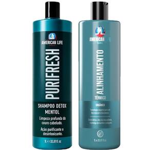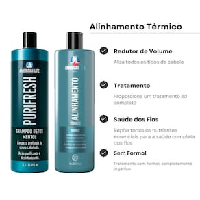 Sistema de alinhamento térmico orgânico com tecnologia vegetal para um liso natural e duradouro, redução de volume e controle de frizz. Promove brilho, maciez e toque sedoso enquanto trata a fibra. Principais ativos e funções 1 Ácido lático: ativo ácido que alinha e sela cutículas, auxilia na redução de volume e frizz, melhora brilho e maleabilidade. 2 Óleo de macadâmia: repõe lipídios, nutre e aumenta o brilho. 3 de karité: emoliência, maciez e proteção contra ressecamento. 4 Colágeno: forma filme hidratante, melhora elasticidade e resistência. 5 Base com condicionantes catiônicos e silicones que contribuem para desembaraço e efeito liso com calor. Indicação Todos os tipos de cabelo lisos, ondulados, cacheados que buscam alinhamento, redução de volume e frizz. Compatível com coloração e outras químicas após teste de mecha. Modo de uso Siga sempre com luvas e em ambiente ventilado. Faça teste de mecha e prova de toque. 1. Diagnóstico e preparo Faça o teste de mecha, não é necessário lavar. Se o cabelo estiver com muito resíduo ou oleosidade, lave com shampoo suave e seque 100%, agite o frasco. Dívida em quadrantes. Proteja contorno do rosto. 2. Aplicação Com pincel e pente, aplique mecha a mecha deixando 1 cm da raiz, distribuindo até as pontas sem encharcar. Alinhe bem com o pente. 3. Tempo de pausa Loiros, finos, sensibilizados: 30 a 40 min., Normais: 40 a 60 min, Grossos e resistentes ouvirgens: 60 a 90 min. 4. Enxágue Retire conforme o diagnóstico, Loiros e sensíveis: retire 60 a 80%, Normais: retire 40 a 60%, Resistentes: retire 20 a 40%. 5. Finalização Após esfriar, enxágue 100% opcional em cabelos muito resistentes e trate com máscara hidratante. Finalize como desejar escova ou selagem leve. Para manutenção, use Shampoo + Máscara American Life Hidratação. Dica Em cabelos loiros e ou porosos, reduza temperatura e número de passes; finalize com máscara nutritiva para brilho máximo. Em fios muito resistentes, aumente levemente o tempo de pausa e mantenha mais passes na raiz. Anvisa 25351097867202234