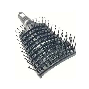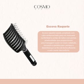 Escova raquete vazada, projetada com cabo emborrachado para um manuseio confortável e cerdas de nylon com pontas arredondadas que proporcionam uma massagem suave no couro cabeludo, tornando-a perfeita para pentear e desembaraçar os fios de forma eficiente e sem causar desconforto.