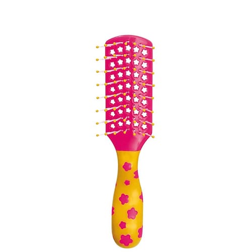 É indicada para todos os tipos de cabelos das crianças. Ela proporciona uma escovação confortável por possuir cerdas de nylon, base almofadada e nas pontas proteção específica para massagear o couro cabeludo.