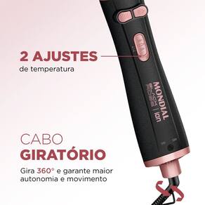 Caracteristicas: Modelo: ERB01 Marca: Mondial Funcoes: 3 em 1 seca, alisa e modela Potencia: 1200 W Niveis de temperatura: 2 Revestimento ceramico: Sim Cerdas: Mistas flexiveis para alinhar os fios e de nylon para modelar Cabo: Giratorio Voltagem: Bivolt com chave seletora Emissao de ions -Turmalina-: Sim Rotativa: Sim