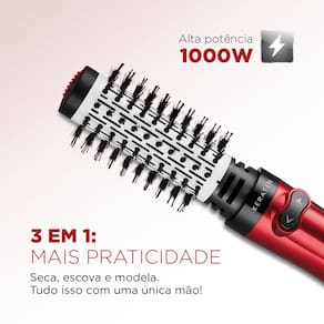 3 EM 1: Com um único produto, você seca, alisa e modela. Tudo isso de forma prática: utilize uma única mão e dê adeus ao malabarismo de usar escova em uma mão e secador na outra. A escova alisa cabelos secos, úmidos e até molhados, além de finalizar perfeitamente pontas e franjas.