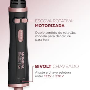 - Escova Rotativa Motorizada: permite modelar o cabelo para dentro ou para fora