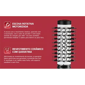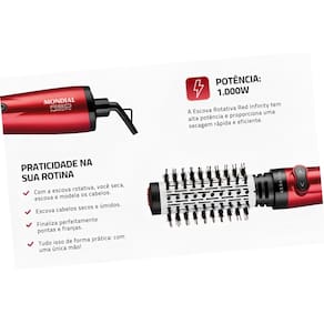 - **Nome do produto**: Escova Rotativa Red Infinity Keratin 1000W - **Marca**: MONDIAL - **Modelo**: ER-11-KR - **Potência**: 1000 watts - **Voltagem**: 110V ou 220V (escolha a voltagem correta) - **Dimensões do produto**: 7 x 37 x 7 cm - **Peso**: 470 g - **Tipo de Cabelo**: Todos os tipos de cabelo - **Cabo**: Giratório 360° - **Certificação**: BRA19/00417 - **EAN**: 7899882313284, 7898578152916