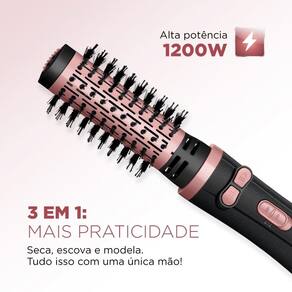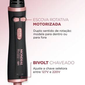 Características Adicionais: Escova Rotativa Motorizada: une o movimento rotativo da escovação com o calor do secador. E gira nos dois sentidos para modelar. Tourmaline Íon: a tecnologia fecha as cutículas dos fios e reduz o frizz. Garantia de cabelos mais saudáveis, macios e brilhantes! 3 em 1: a escova Mondial seca, alisa e modela. E você faz tudo isso com uma única mão! Cabo 360°: o fio é giratório, não enrola durante o uso e é mais fácil de manusear. 2 Temperaturas: Ajuste a intensidade de acordo com o seu tipo de cabelo e o resultado que deseja. Cerdas Mistas: Possui dois tipos de cerdas diferentes: as flexíveis alinham os fios, enquanto as de nylon são perfeitas para modelar.