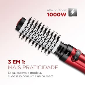 3 EM 1: Com um único produto, você seca, alisa e modela. Tudo isso de forma prática: utilize uma única mão e dê adeus ao malabarismo de usar escova em uma mão e secador na outra. A escova alisa cabelos secos, úmidos e até molhados, além de finalizar perfeitamente pontas e franjas. SAÚDE DOS FIOS: CERÂMICA + QUERATINA: A escova rotativa Mondial possui revestimento em cerâmica com queratina e distribui o calor de maneira uniforme. Com o aquecimento, a Queratina libera partículas que garantem a proteção dos fios. O resultado: fios mais fortes, saudáveis, alinhados e sem frizz. ALTA POTÊNCIA: Os 1.000W promovem uma secagem rápida e eficiente. 2 TEMPERATURAS + AR FRIO: Ajuste a intensidade de acordo com o seu tipo de cabelo e o resultado que deseja. Depois de seco e modelado, o jato frio promove melhor acabamento e reduz o frizz. CABO GIRATÓRIO 360: Mais fácil de manusear: o fio da escova rotativa é giratório e não enrola durante o uso.