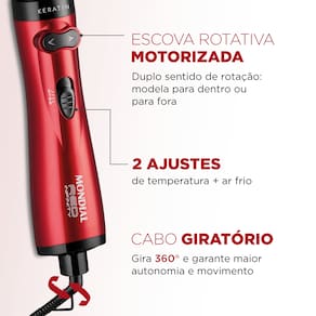 Escova Rotativa Red Infinity Keratin ER-11 - Mondial 110V Seca, alisa e modela: a Red Infinity Keratin é 3 em 1 e muito prática de usar! Com a escova rotativa, você produz os cabelos utilizando uma única mão. Além disso, o item possui revestimento cerâmico com queratina e protege os fios, deixando-os mais fortes, saudáveis e sem frizz. Saiba mais sobre a ER-11-KR da Mondial: ESCOVA ROTATIVA MOTORIZADA: A escova Mondial une o movimento rotativo, parecido com a escovação, com o calor do secador. E tem duplo sentido de rotação: gira 360° nos dois sentidos, permitindo modelar o cabelo para dentro ou para fora. 3 EM 1: Com um único produto, você seca, alisa e modela. Tudo isso de forma prática: utilize uma única mão e dê adeus ao malabarismo de usar escova em uma mão e secador na outra. A escova alisa cabelos secos, úmidos e até molhados, além de finalizar perfeitamente pontas e franjas. SAÚDE DOS FIOS: CERÂMICA + QUERATINA: A escova rotativa Mondial possui revestimento em cerâmica com queratina e distribui o calor de maneira uniforme. Com o aquecimento, a Queratina libera partículas que garantem a proteção dos fios. O resultado: fios mais fortes, saudáveis, alinhados e sem frizz. ALTA POTÊNCIA: Os 1.000W promovem uma secagem rápida e eficiente. 2 TEMPERATURAS + AR FRIO: Ajuste a intensidade de acordo com o seu tipo de cabelo e o resultado que deseja. Depois de seco e modelado, o jato frio promove melhor acabamento e reduz o frizz. CABO GIRATÓRIO 360°: Mais fácil de manusear: o fio da escova rotativa é giratório e não enrola durante o uso Informações Técnicas Modelo ER-11-KR Cor Vermelho/Preto Voltagem (Tensão) 127V Itens inclusos: 01 Escova Rotativa - Manual de Instruções Peso: 0,460kg Funções: Alisar, secar e modelar Garantia: 01 ano Controle de temperatura: Sim Níveis de temperaturas: 03 níveis Cabo giratório: Sim, 360º Tecnologias (emite íons): Não se aplica Revestimento: Revestimento cerâmico com queratina Potência: 1000W