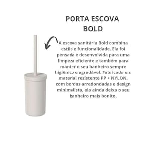 A escova sanitária Bold combina estilo e funcionalidade. Ela foi pensada e desenvolvida para uma limpeza eficiente e também para manter o seu banheiro sempre higiênico e agradável. Fabricada em material resistente PP + NYLON, com bordas arredondadas e design minimalista, ela ainda deixa o seu banheiro mais bonito. Características do Produto: