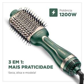 3 EM 1: SECA, ALISA E MODELA: O poder do secador aliado à facilidade da escova. Você seca, escova e modela o cabelo ao mesmo tempo, com uma única mão.