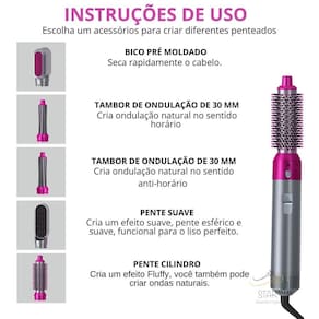 ------------------ conteúdo ------------------ 1x suporte de escova. 1x bico secador de cabelo. 1x bico de ondulação anti-horário. 1x bico de ondulação sentido-horário. 1x bico pente alisador. 1x bico pente cilindro