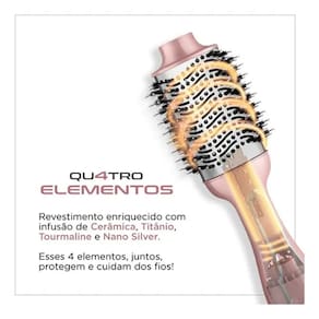 A Escova Secadora da Linha by Juliette Quatro Elementos traz um revestimento especial enriquecido com infusão de Cerâmica, Titânio, Tourmaline e Nano Silver. Esses 4 elementos, juntos, protegem seus fios e garantem uma aparência mais saudável aos cabelos, com brilho intenso, maciez e sem frizz.