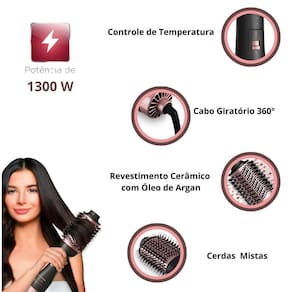 Atenção - a voltagem da escova é 110v. Não ligue em tomadas com voltagens de 220v. Atenção não é rotativa o giro 360º é manual Apresentação Sobre a mondial A mondial é uma empresa brasileira de eletrodomésticos portáteis, fundada em 2000 pelo empresário giovanni martins cardoso. Sua maior planta, na cidade baiana de conceição do jacuípe, possui 241.000 m2 e emprega 2.200 funcionários. A mondial é uma das líderes do mercado brasileiro de eletrodomésticos portáteis. A empresa é conhecida por seus produtos de alta qualidade e bom custo-benefício. Sabe aquele cabelo bem cuidado, lindo e brilhante, igual de salão de beleza Agora você pode fazer em casa, com a escova secadora mondial black rose argan es-14, com revestimento cerâmico ela possibilita a melhor distribuição do calor de forma uniforme, para uso nos cabelos ainda úmidos, da raiz até as pontas. Com três níveis de temperatura, você escolhe se quer alisar, modelar ou dar volume aos seus fios. Moderna, bonita e fácil de usar, a escova secadora mondial es-14 possui o design oval, é leve e ergonômico, além de possuir o cabo giratório 360º. Uma rotina mais prática de cuidados com as mechas a escova secadora black rose argan é 3 em 1: você seca, alisa e modela com uma única mão e deixa seu cabelo lindo em minutos. Além disso, a escova possui revestimento com tourmaline íon, tecnologia que reduz o frizz, dá brilho e maciez aos fios. 1 produto, 3 funções: seca, alisa e modela com a escova secadora black rose argan, você deixa os cabelos lindos usando apenas uma mão para modelar. É muita praticidade além disso, o revestimento com óleo de argan cuida da saúde dos fios, deixando as mechas protegidas e hidratadas. Saiba mais sobre a es-14 da mondial: Óleo de argan: revestimento com óleo de argan, ingrediente rico em nutrientes e antioxidantes. Perfeito para a saúde das mechas Escova 3 em 1: você seca, alisa e modela utilizando apenas um produto e com uma única mão. É muita praticidade Alta potência: são 1.200w para secar seu cabelo com rapidez e eficiência. Design oval: facilita a escovação o formato da escova secadora é perfeito para alisar, além de também ser um aliado para quem quer dar volume às mechas. Cerdas mistas: os formatos diferentes permitem alinhar e modelar o cabelo ao mesmo tempo. Ponta fria: a ponteira da escova mondial não aquece e protege suas mãos durante o uso. 3 variações de temperatura: ajuste a intensidade do calor de acordo com seu tipo de cabelo. Cabo 360: o fio é giratório e não enrola durante o uso. Cabo embolado nunca mais Especificações: Modelo: es-14 Cor: preto/golden rose Voltagem tensão : 110v Potência: 1200w Consumo: 1.2kw/h Nível temperatura: 3 Temperatura máxima: 230c. Cabo giratório: sim Revestimento: cerâmica Emite íons: sim Funções: secar escovar e modelar Visor lcd: não Ean: 7899882312898 do fabricante: 12 meses Características gerais: Moderna com design oval Indicado para secar, escovar e modelar Fácil de usar Potência de secador com praticidade de escova Libera íons que eliminam o frizz e proporcionam mais brilho aos cabelos Revestimento cerâmico que distribui o calor uniformemente e permite maior proteção e rapidez para secar e modelar o cabelo Seletor de temperatura, até 3 temperaturas Cerdas mistas com pontas arredondadas e cerdas menores de nylon Ponta fria Leve e ergonômico Dimensões do produto: Altura: 34 cm Largura: 10.5 cm Profundidade: 8 cm Peso: 0.521 gramas Dimensões do produto embalado: Altura: 11.3