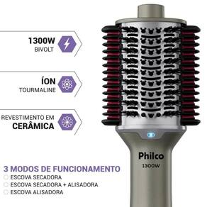 Escova Secadora Philco PES30 Bivolt. Transforme sua rotina de cuidados com os cabelos com a Escova Secadora Philco PES30 Bivolt, ideal para quem busca praticidade, eficiência e beleza todos os dias. Com design leve, ergonômico e fácil de manusear, ela seca e modela ao mesmo tempo, entregando resultado de salão na sua casa. Seja para alisar, modelar ou dar volume, a PES30 oferece um desempenho incrível com tecnologia que protege os fios e reduz o frizz. Seu sistema de emissão de íons Tourmaline cuida dos cabelos enquanto estiliza Garantindo brilho, suavidade e um visual impecável Principais Características Tecnologia Tourmaline Íon: reduz frizz e dá brilho ao cabelo 2 em 1: escova + secador em um só aparelho Resultado rápido com efeito natural e duradouro Ideal para todos os tipos de cabelo Leve, compacta e fácil de transportar Revestimento cerâmico: protege os fios contra o calor excessivo Cabo giratório 360: liberdade de movimentos Design oval: ideal para alisar e modelar com volume na raiz Bivolt automático: pode ser Utilizado em qualquer lugar Potência de 1.300W: seca rapidamente com eficiência 2 temperaturas + ar frio: ideal para finalizar o penteado usos 1 Escova Secadora Philco PES30 Bivolt 1 Manual de instruções 1 Certificado de Fabricante icações Técnicas Modelo: PES30 Marca: Philco Potência: 1.300W Voltagem: Bivolt automático 127V/220V Níveis de temperatura: 2 + ar frio Cabo elétrico: Giratório 360, com aprox. 1,8m Material do corpo: Plástico resistente com detalhes em acabamento metálico Cor: Prata com detalhes rosa Dimensões: Altura: 11,5cm Largura: 9cm Comprimento: 38cm Peso com embalagem : aproximadamente 560g Marca: Não Informado Ean: 7891356119736