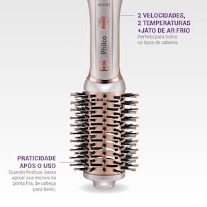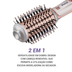 A Escova secadora Philco PES32 possui design com cabeça removível que permite a utilização como escova modeladora ou secador, uma solução 2 em 1 para atender às suas necessidades.