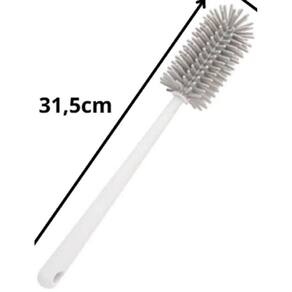 Características: - Cor: Branco/Cinza - Marca: Clink - Possui furo no cabo para pendurar. - Material cabo e cerdas: Silicone/Plastico - Medidas: 21cm comprimento cabo x 10,5cm comprimento cerdas / 5,5cm diâmetro cerdas x 31,5cm comprimento total