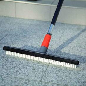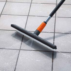 Remove a sujeira com as cerdas fortes do escovão e, em seguida, faz a lavagem com a ajuda do cabo condutor (não incluso). Superfícies robustas, como terraços, calçadas, porões, entradas de garagem e etc. são limpas com muita eficiência com este escovão. O bico de jato plano dissolve a sujeira mais dura. Graças à largura de trabalho extra grande de 43 cm, a limpeza progride rapidamente.