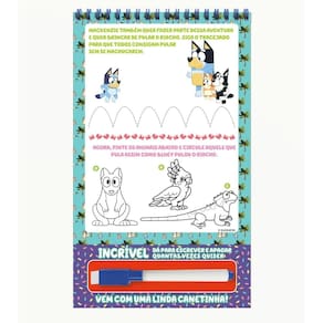 Prepare-se para uma aventura emocionante com o Riscabook Bluey Explore páginas repletas de diversão e aprendizado com Bluey, Bingo e seus amigos. Com a caneta especial inclusa, você pode desenhar, escrever e apagar, tornando cada página uma nova aventura Junte-se à Bluey e descubra um mundo de aprendizado e diversão