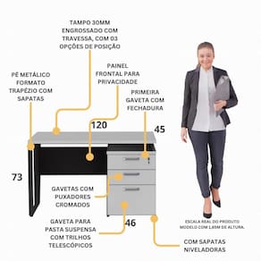 Diferenciais: - Produzida em MDP proveniente de reflorestamento: durável e sustentável. - Acabamento em BP: superfície sofisticada e fácil de limpar. - Flex: pode ser montada com o gaveteiro no lado esquerdo ou direito. - Tampo de 30mm: suporta até 25kg para apoiar materiais de trabalho. - 2 gavetas com corrediças metálicas e 1 gaveta para pasta suspensa com corrediças telescópicas. - Fechadura na primeira gaveta: mantém documentos e objetos pessoais em segurança. - Pés metálicos em formato de trapézio com sapatas: maior estabilidade. - Puxadores cromados: oferecem resistência e um visual elegante.