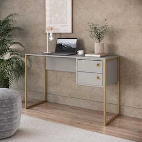 Produto com design moderno, unindo praticidade e conforto. A mesa escrivaninha conta com duas gavetas para melhor organização de seus materiais e é produzida com com mdp 1,5cm e tubo em metal de 1,5x1,5cm. O móvel ideal para compor seu ambiente office. Produto Montado: Sim Acabamento do Tampo: Finish Foil Acabamento dos Pés: Pintura Acompanha Manual de Instalação: Sim Ambiente Principal: Escritório codigo_ean: 7900288196897 Complexidade da Montagem: Média: pode ser montado por mais de uma pessoa e/ou necessite de maior conhecimento para montagem Cor: Arena / Champagne Cor da Base: Dourado Cor do Produto: Arena / Champagne Cor do Tampo: Cinza Cor Flex: Não Dobrável: Não Escala de Brilho: Fosco Espessura do Tampo: 15 mm Formato: Retangular Gaveta com Chave: Não Itens Inclusos: 1 Escrivaninha, Kit Ferragens e Manual de Montagem Linha ou Coleção: Retrô Manual de Montagem e Instalação: https://product-hub-prd.madeiramadeira.com.br/305243502/documents/8134e485-211d-4698-bc2e-bba3bd9398aa3072252628917526598155515.pdf Marca: Placa e Ponto Material da Estrutura: Metal Material do Puxador da Gaveta: Plástico Material do Tampo: MDP Material dos Pés: Aço Material Principal: MDP Modelo Infantil: Não Montagem Flex: Não Necessita Montagem: Sim Origem do Produto: Nacional Pés com Regulagem de Altura: Não Pés Reguláveis: Não Peso: 28 kg Peso Máximo por Gaveta: 3 kg Possui Acabamento na Parte de Trás: Não Possui Borda Arredondada: Não Possui Caixa de Tomada: Não Possui Espelhos: Não Possui Estante: Não Possui Gaveta para Pasta Suspensa: Não Possui Gaveteiro: Sim Possui Passa Cabos: Não Possui Porta Objetos: Não Possui Portas: Não Possui Prateleiras: Não Possui suporte para CPU: Não Possui Suporte para Teclado: Não Possui Vidro: Não Quantidade de Gavetas: 02 Gavetas Recomendações de Uso, Manutenção e Limpeza: Para a limpeza do móvel utilizar uma flanela seca. Sapatas Niveladoras: Sim Sistema de Montagem: Parafusos, cavilhas e minifix Suporta Até (kg): 35 kg Tipo de Corrediça da Gaveta: Metálica Simples