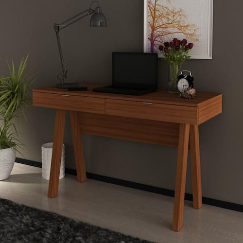 Escrivaninha Escritório Tecnomobili ME4128, possui 2 gavetas com amplo espaço para armazenar objetos e/ ou documentos e com puxadores em alumínio escovado, material em MDP, acabamento em BP, pés em MDF laqueado, tipo cavalete. Produto Montado: Sim Acabamento da Gaveta: BP Acabamento da Prateleira: BP Ambiente: Escritório Ambiente Principal: Escritório codigo_ean: 7908167282310 Complexidade da Montagem: Média: pode ser montado por mais de uma pessoa e/ou necessite de maior conhecimento para montagem Cor do Produto: Amendoa Cor Interna: Amendoa Dobrável: Não Escala de Brilho: Fosco Escala de Brilho da Gaveta: Fosco Escala de Brilho da Prateleira: Semi-Fosco Espessura do Tampo: 15 mm Formato: Retangular Gaveta com Chave: Não Informações Complementares: 20 Kg no tampo e 3 Kg cada gaveta Itens Inclusos: 1 Mesa e Manual de Montagem Manual de Montagem e Instalação: https://product-hub-prd.madeiramadeira.com.br/600037/documents/83086c14-3e3a-406b-b268-9e10397cb5211317manualdemontagemme4128.pdf Material da Gaveta: MDP Material da Prateleira: MDP Material do Puxador: Alumínio escovado Material Principal: MDP Montagem Flex: Sim, produto pode ser montado de formada espelhada. Necessita Montagem: Sim Peso: 24 kg Peso Máximo por Gaveta: 3 kg Possui Passa Cabos: Não Possui Pés: Não Possui Porta Objetos: Não Possui Portas: Não Possui Prateleiras: Não Possui suporte para CPU: Não Possui Suporte para Teclado: Não Quantidade de Gavetas: 02 Gavetas Recomendações de Uso, Manutenção e Limpeza: Utilizar somente pano úmido e sabão neutro. Sapatas Niveladoras: Não Sistema de Montagem: Montar o móvel deitado de costas. Forrar o chão com o papelão das embalagens, aconselhamos a ser feita por um profissional, não expor o móvel a fontes de calor ou de umidade. Suporta Até (kg): 20 kg Tipo de Puxador: Externo Tipo de Puxador da Gaveta: Externo Ean: 7908167282310