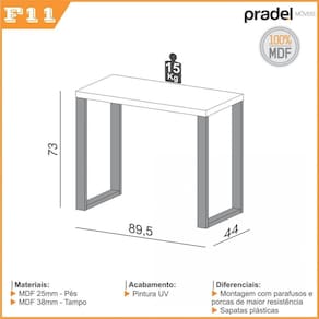 A PRADEL traz a mesa de trabalho industrial F10, disponível na Cr freijó com preto fosco. Com um estilo moderno e minimalista, o móvel conta com com uma bancada de 89,5cm de largura de 135cm combinando com seu quarto, sala ou escritório. Uma solução simples e prática para seus estudos ou trabalho. A Mesa de Trabalho Industrial F11 possui estrutura 100% MDF e pintura UV, com um excelente acabamento proporcionando uma maior durabilidade ao móvel. Possui Suporte para Teclado: Não Possui Passa Cabos: Não Acabamento: Pintura UV Altura: 73 cm Ambiente Principal: Escritório Complexidade da Montagem: Média: pode ser montado por mais de uma pessoa e/ou necessite de maior conhecimento para montagem Cr: Freijó/Preto Cr do Produto: Freijó/Preto Cr Interna: Freijó Escala de Brilho: Fosco Estilo: Industrial Formato: Retangular Itens Inclusos: 1 Escrvaninha, Kit Ferragens e Manual de Montagem Largura: 89,5 cm Linha ou Coleção: LINHA INDUSTRIAL Manual de Montagem e Instalação: https://cdn2.madeiramadeira.com.br/atributo/dalla-costa/808326-f11.pdf Material dos Pés: MDF Material Principal: MDF Necessita Montagem: Sim Origem do Produto: Nacional Pés Reguláveis: Não Peso: 10,5 kg Possui Gavetas: Não Possui Pés: 02 Possui Porta Objetos: Não Possui Portas: Não Possui Prateleiras: Não Possui Rodízio: Não Possui suporte para CPU: Não Profundidade: 44 cm Recomendações de Uso, Manutenção e Limpeza: Pano levemente umedecido Sapatas Niveladoras: Não Sistema de Montagem: Parafusos Suporta Até (kg): 15 kg Tamanho:
