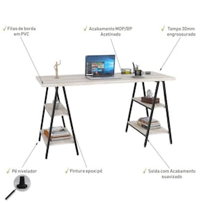 A Mesa Cavalete KUMC6150 Kuadra é um produto prático e versátil, que pode ser utilizado em diversos ambientes, como quarto e escritório, na sala, cozinha ou seu depósito. Conta com 04 prateleiras reforçadas e seu design industrial permite diversas composições de decoração com os demais módulos da linha. Pés com espessura de 30x20mm. Produto Montado: Sim Acabamento da Prateleira: BP Acabamento dos Pés: Pintura Ambiente Principal: Escritório codigo_ean: 7909903211885 Complexidade da Montagem: Média: pode ser montado por mais de uma pessoa e/ou necessite de maior conhecimento para montagem Cor: Snow/Preto Cor do Produto: Snow/Preto Cor Interna: Snow Escala de Brilho: Fosco Escala de Brilho da Prateleira: Fosco Espessura do Tampo: 30 mm Formato: Retangular Gaveta com Chave: Não Itens Inclusos: 1 Escrivaninha, Kit Ferragens e Manual de Montagem Linha ou Coleção: Kuadra Manual de Montagem e Instalação: https://product-hub-prd.madeiramadeira.com.br/806616/documents/2ea461cd-7409-4828-9278-1af4c47f1c4c1108761manualnovocavalete.pdf Material da Prateleira: MDP Material dos Pés: Aço Material Principal: MDP Montagem Flex: Não, só é possível a montagem do produto conforme imagem do anúncio. Necessita Montagem: Sim Origem do Produto: Nacional Peso: 25,79 kg Peso Máximo por Prateleira: 5 kg Possui Passa Cabos: Não Possui Pés: 02 Possui Porta Objetos: Não Possui Portas: Não Possui Prateleiras: Sim Possui Suporte para Teclado: Não Quantidade de Prateleiras: 04 Prateleiras Recomendações de Uso, Manutenção e Limpeza: Para a limpeza, utilize flanela seca ou pano macio levemente umedecido em água. Utilize um pano seco em seguida. Evite contato com produtos químicos (solventes, thinner, acetona, etc) e não utilize nenhum tipo de esponja de aço. Sapatas Niveladoras: Sim Sistema de Montagem: Parafusos Suporta Até (kg): 50 kg Ean: 7909903211885