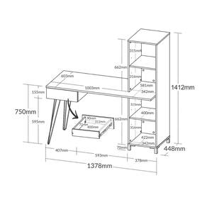 Ela é indicada para Escritórios, Salas de Estar ou Quartos. Ela possui tampo de 18mm com borda ABS de 2mm. Possui também uma gaveta com corrediça telescópica, duas prateleiras com regulagem de altura.