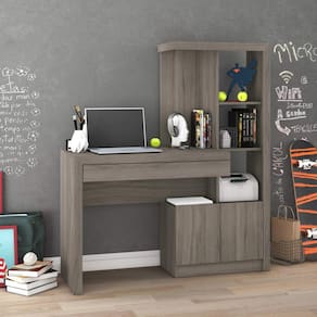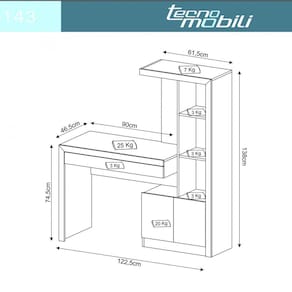 Nada melhor que um quarto organizado, o estudo até rende mais não é mesmo?! Para isso indicamos a Escrivaninha 1 Gaveta 2 Portas 2 Prateleira Tecno Mobili, Estrutura em MDF, Acabamento em BP. Ideal para estudos e organização do quarto. Acabamento da Gaveta: BP Acabamento da Porta: BP Acabamento da Prateleira: BP Acabamento dos Pés: PU Altura dos Pés: 0,3 cm Complexidade da Montagem: Baixa: pode ser montado por uma pessoa sozinha Escala de Brilho: Semi-Fosco Escala de Brilho da Gaveta: Semi-Fosco Escala de Brilho da Porta: Semi-Fosco Escala de Brilho da Prateleira: Semi-Fosco Formato: Retangular Gaveta com Chave: Não Itens Inclusos: 1 Escrivaninha, manual de montagem e kit ferragem. Material da Gaveta: MDP Material da Porta: MDP Material da Prateleira: MDF Material dos Pés: PVC Material Principal: MDP Necessita Montagem: Sim Pés Reguláveis: Não Peso: 32,95 kg Peso Máximo por Gaveta: 3 kg Peso Máximo por Prateleira: 3 kg Possui Passa Cabos: Não Possui Pés: 06 Possui Porta Objetos: Não Possui Portas: 02 Possui Prateleiras: 02 Possui suporte para CPU: Não Possui Suporte para Teclado: Não Quantidade de Nichos: 03 Recomendações de Uso, Manutenção e Limpeza: Utilizar somente pano úmido e sabão neutro. Sapatas Niveladoras: Sim Sistema de Montagem: Parafusos, cavilhas e minifix. Suporta Até (kg): 64 kg Tipo de Corrediça da Gaveta: Metálica Simples Tipo de Dobradiça/Corrediça da Porta: Metálica Tipo de Puxador da Gaveta: Embutido Tipo de Puxador da Porta: Embutido