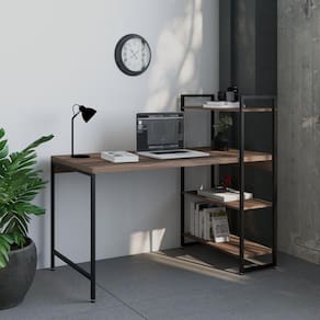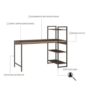 A Mesa c/Estante Active ACEMA6135 é um produto prático e versátil, que pode ser utilizado em diversos ambientes, como quarto e escritório, na sala, cozinha ou seu depósito. Conta com estrutura em aço com pintura epóxi além de 03 prateleiras acopladas, deixando seus objetos mais organizados e ao alcance das mãos. Acabamento da Gaveta: Acabamento da Porta: Acabamento da Prateleira: BP Acabamento dos Pés: Altura dos Pés: Ambiente Principal: Escritório Complexidade da Montagem: Média: pode ser montado por mais de uma pessoa e/ou necessite de maior conhecimento para montagem Cor: Nogal Cor da Base: Preto Cor do Produto: Nogal Cor do Tampo: Marrom Cor Flex: Cor Interna: Nogal Escala de Brilho: Fosco Escala de Brilho da Gaveta: Escala de Brilho da Porta: Escala de Brilho da Prateleira: Fosco Formato: Retangular Gaveta com Chave: Informações Complementares: Itens Inclusos: 1 Escrivaninha, Kit Ferragens e Manual de Montagem Largura Frontal: Largura Lateral: Linha ou Coleção: Active Manual de Especificação Técnica: Manual de Montagem e Instalação: https://cdn2.madeiramadeira.com.br/atributo/compace-dalex/1058687-manual-mesa-estante-1-35-3p-active.pdf Material da Gaveta: Material da Porta: Material da Prateleira: MDP Material do Puxador da Gaveta: Material do Puxador da Porta: Material dos Pés: Aço Material Principal: MDP Montagem Flex: Necessita Montagem: Sim Origem do Produto: Nacional Pés com Regulagem de Altura: Pés Reguláveis: Peso: 21.2 Peso Máximo por Gaveta: Peso Máximo por Prateleira: 8 Possui Passa Cabos: Não Possui Pés: 02 Possui Porta Objetos: Não Possui Portas: Não Possui Prateleiras: 03 Possui suporte para CPU: Possui Suporte para Teclado: Não Quantidade de Nichos: Recomendações de Uso, Manutenção e Limpeza: Para a limpeza, utilize flanela seca ou pano macio levemente umedecido em água. Utilize um pano seco em seguida. Evite contato com produtos químicos (solventes, thinner, acetona, etc) e não utilize nenhum tipo de esponja de aço. Rodízio com Trava: Sapatas Niveladoras: Sim Sistema de Montagem: Parafusos Suporta Até (kg): 54 Tipo de Corrediça da Gaveta: Tipo de Dobradiça/Corrediça da Porta: Tipo de Madeira Maciça: Tipo de Madeira Maciça da Gaveta: Tipo de Madeira Maciça da Porta: Tipo de Madeira Maciça da Prateleira: Tipo de Madeira Maciça do Puxador da Gaveta: Tipo de Madeira Maciça do Puxador da Porta: Tipo de Madeira Maciça dos Pés: Tipo de Puxador da Gaveta: Tipo de Puxador da Porta: