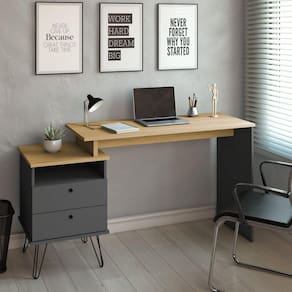 Para ter um bom conforto em casa ou no trabalho, é ideal que os móveis sejam do tamanho apropriado para aquele ambiente, não é? Por isso, a Escrivaninha Plus possui 3 opções de tamanho, que você escolhe durante a montagem: pode ter a largura de 1135cm; 1285cm ou 1435cm! Sua bela combinação de cores no cinza com amadeirado claro harmoniza e traz modernidade ao ambiente.