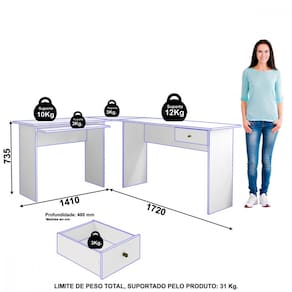 Caracter?sticas: - Estrutura em MDP de 12mm - Suporte para teclado com corredi?as met?licas - Gaveta com corredi?as met?licas - Os m?dulos podem ser montados em ambos os lados e tamb?m em 2 mesas separadas - Puxador de Pl?stico - Acabamento de pintura Fosco - Possui sapatas - Suporte de peso da gaveta: 3 kg - Suporte de peso total: 39 kg - Garantia de 03 meses