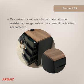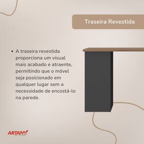 Tampo em MDP 25mm; Estrutura em MDP 15mm; Fundo das gavetas e do gaveteiro em MDF 3mm; Revestimento em BP; Gavetas com corrediças metálicas; Sapatas com regulagem de altura.
